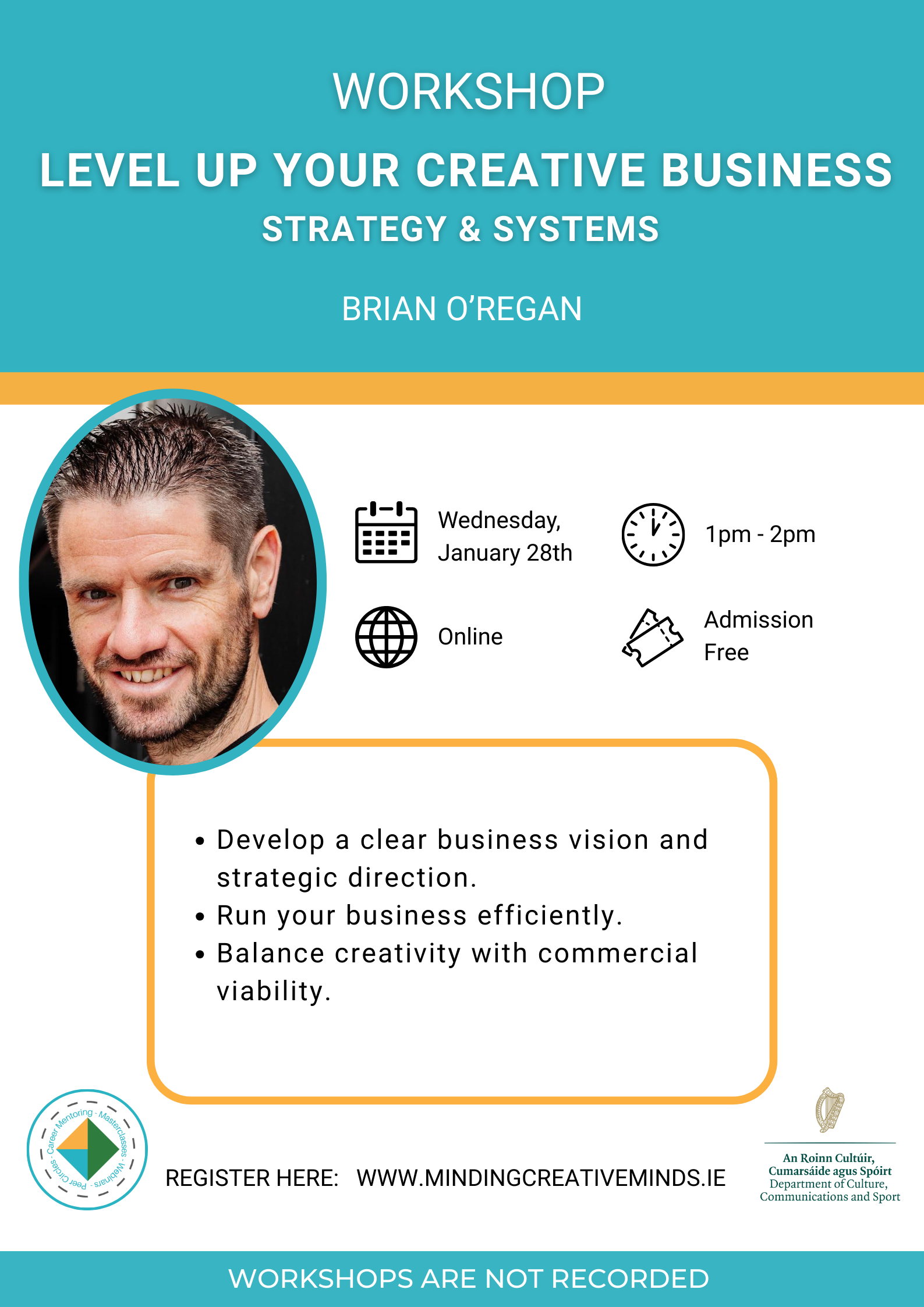 Join us via Zoom for our Workshop with Brian O’Regan. Learn how to turn your vision into a thriving, sustainable business without losing your creative spark.
