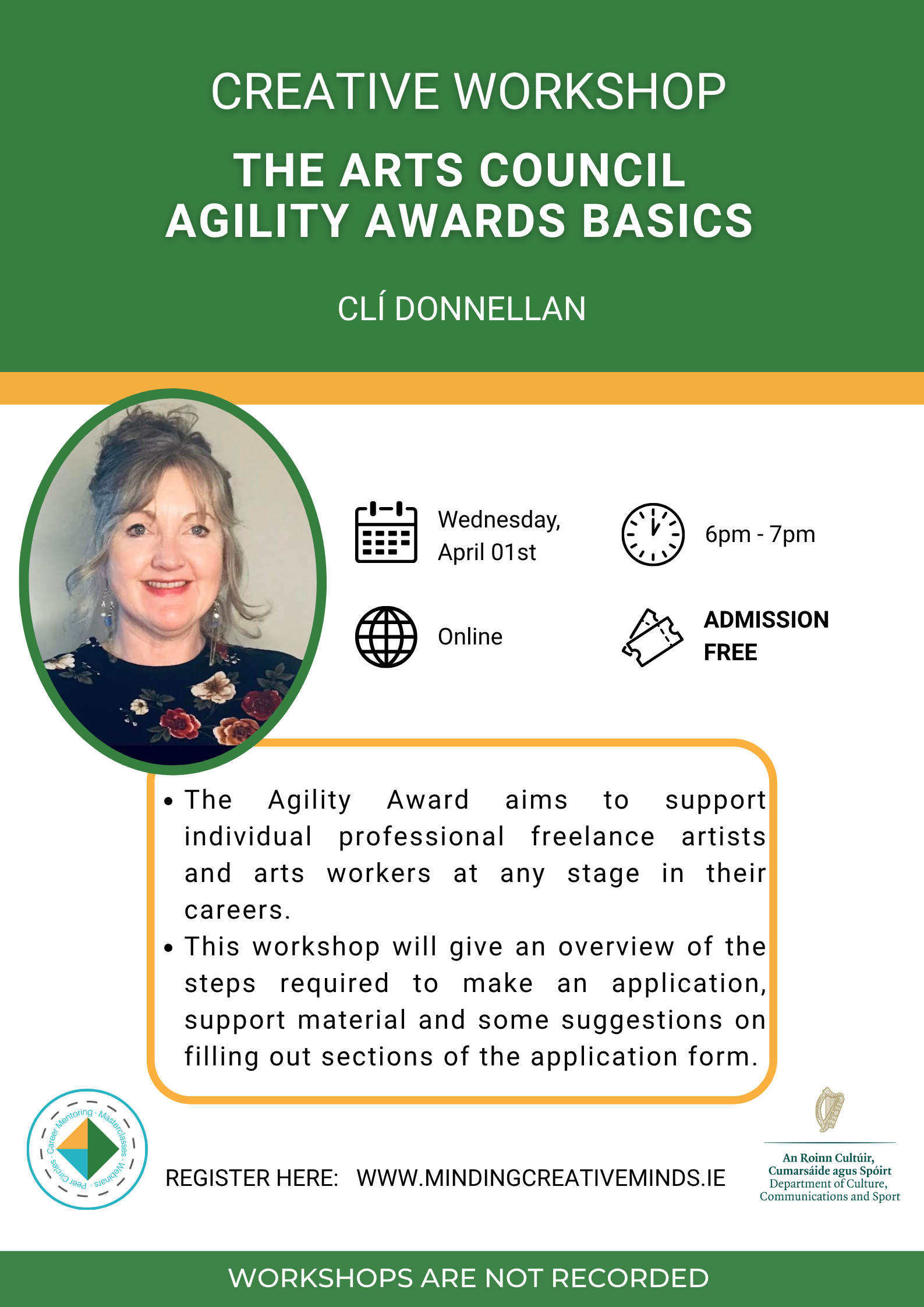 Join us via Zoom for our Workshop with Clí Donnellan who will provides an overview of the application process, required materials, and guidance for completing the form. The Agility Award offers support for freelance artists and arts workers at any stage of their careers.
